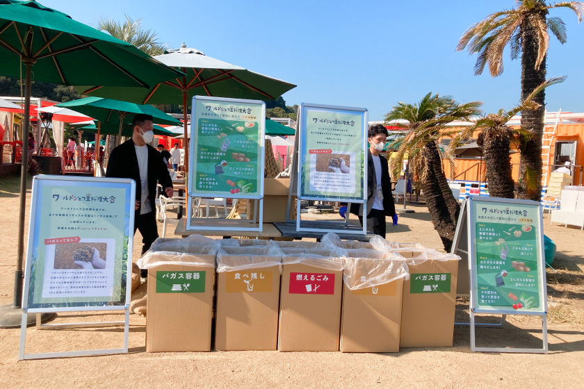 使用済み容器を来場者ご協力のもと回収ステーションで分別回収し、イベントで発生した食べ残しと共にパソナ農援隊で堆肥化を行い、ジャガイモの栽培を行った。使用済みバガス容器が混ざった堆肥や収穫したジャガイモは安全性を証明するために成分分析を行い、安全であることが証明された。
