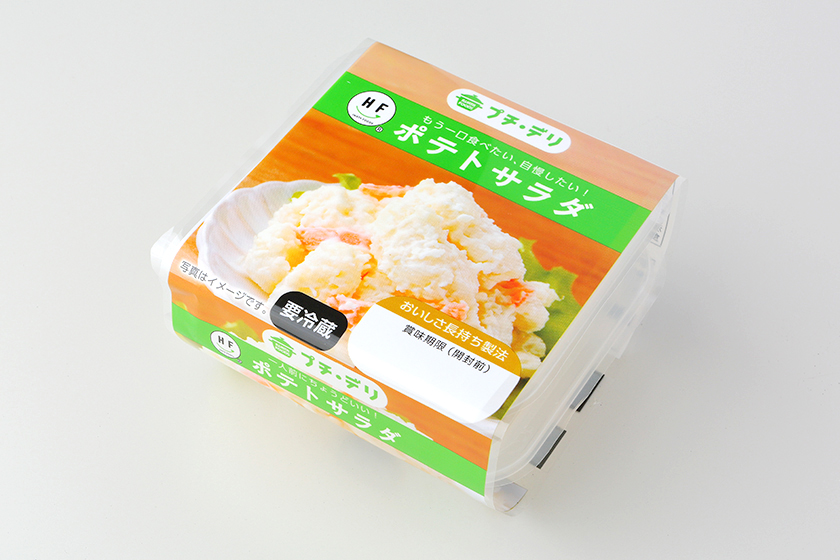 「プチ・デリ」の最大の特長は、約60日間保存可能なカップ型ロングライフ惣菜という点。通常の惣菜は賞味期限が短く、製造や販売、在庫管理に制約が生じやすいという課題がある。真空包装によるロングライフ商品はあるものの、袋からお皿へ移し替える手間が発生し、利便性の面で課題が残る。そこで目指したのが、容器のまま食べられるロングライフ惣菜という商品形態。高齢化や単身世帯の増加といった社会背景も踏まえ、冷蔵庫に常備でき、いつでも手軽に食べられる簡便性を重視。容器や包装仕様の工夫を重ねることで、保存性とおいしさ、使いやすさを両立した惣菜を実現。