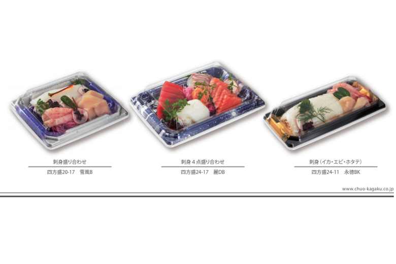 容器メーカー、中央化学株式会社が扱う刺身の容器名。材質は、本体PSP、ふたはC−APG(PETボトルのリサイクル原料を25%以上使用したA-PET)。 厚みのあるフチで包み込む高級感で中身の価値を上げる容器。ふたの天面が広く中身が良く見え、本体の凹凸と、際にある溝でドリップを逃さない形状。柄は5柄あり。(2021年3月現在)
