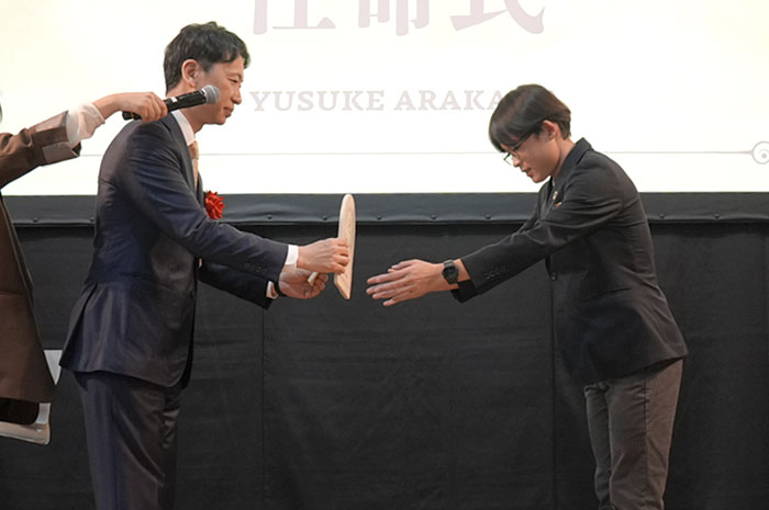 ここで荒川さんへのサプライズとして、研究を続けてくださったことに対する感謝の気持ちとその努力を称え、荒川さんを「折兼バガス大使」に任命。弊社の代表取締役である伊藤より、バガス容器をアップサイクル素材として活用し制作された特別な任命盾が贈呈されました。