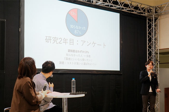 中学校3年間の自由研究でサトウキビの搾りかす「バガス」の研究を独自に続け、研究内容を新聞形式でまとめてきた荒川さん。今回のイベントでは、その3年間にわたる研究成果を発表していただきました。