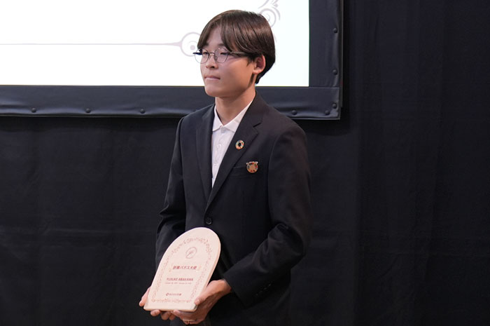 「荒川さんが中学1年生の時に作成されたバガスの研究内容をまとめた新聞を拝見して、大変衝撃を受けた記憶があります。その後も2年生、3年生と研究を深められる様子を見て、大変素晴らしい内容に感心していました。自身も折兼を通じてバガスという素材に出会い、今後の業界を守るためにも、世の中の方々により環境に負荷の少ない商品を使っていただくためにも活動を重ねてまいりました。その中で、荒川さんにバガスを広める顔になってもらうべく、折兼バガス大使に任命させていただきます。」