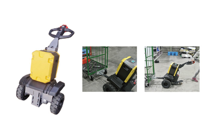 重い荷物を載せた台車の運搬をサポートする、電動アシスト牽引機です。