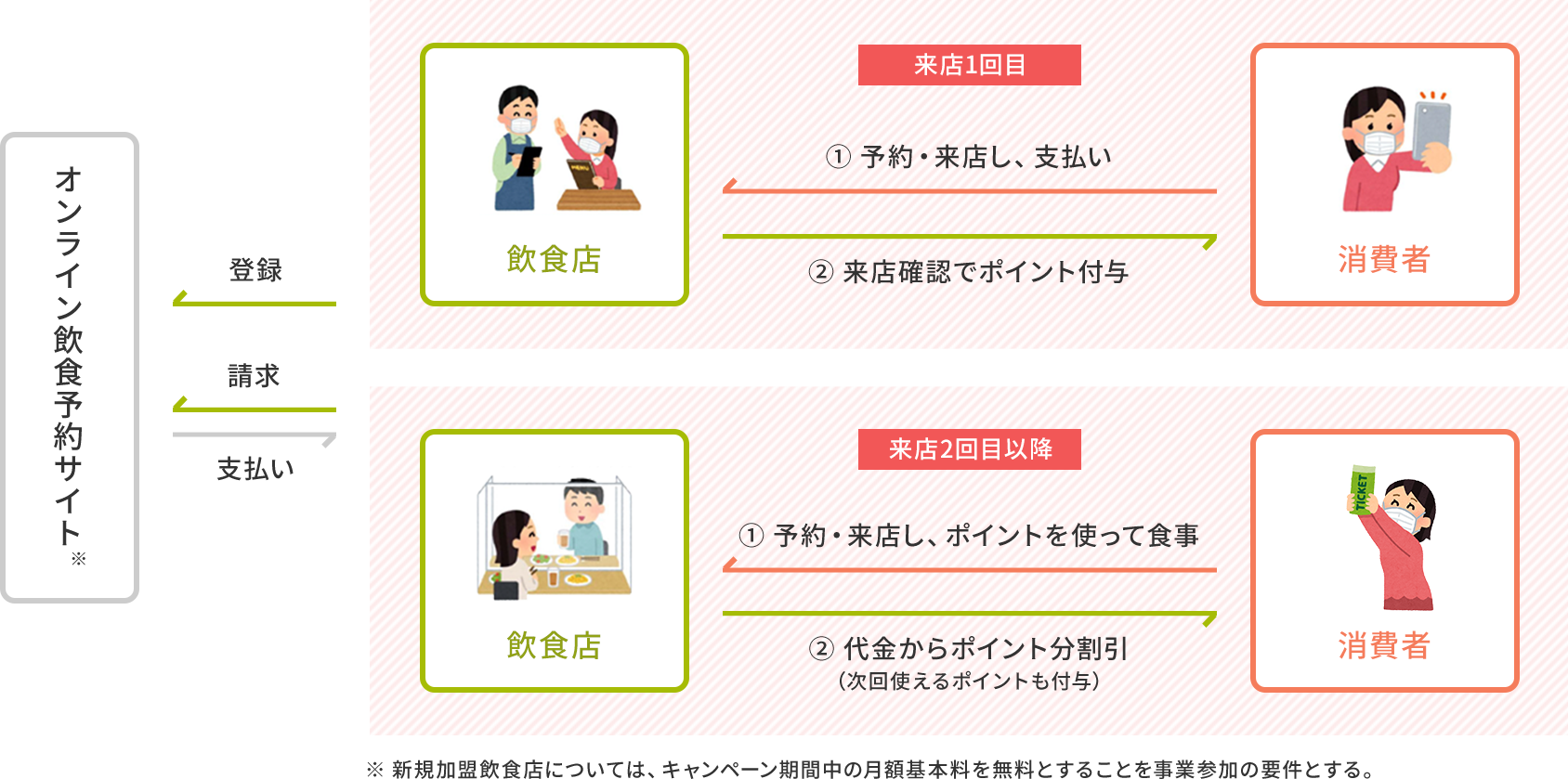 オンライン飲食予約サイト経由で、キャンペーン期間中に予約・来店すると、次回以降にキャンペーンに参加する飲食店で利用できるポイントが付与されます。